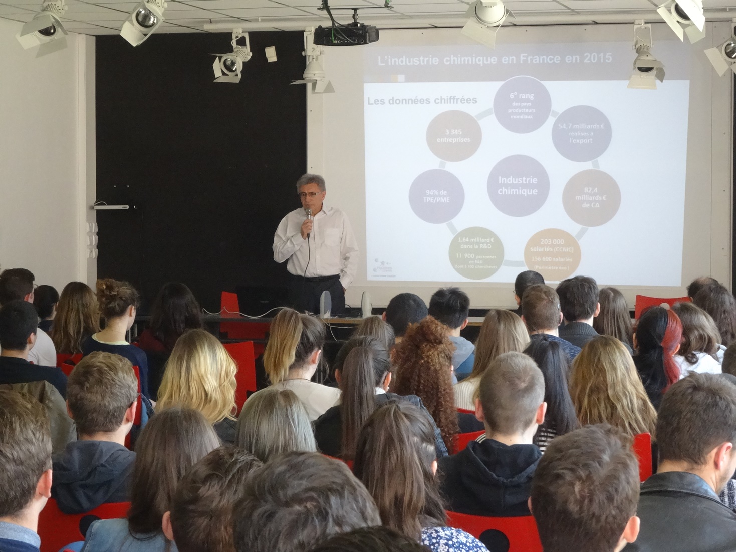 Un premier temps a été consacré à la présentation des métiers de la chimie et de quelques entreprises du bassin. Près de 80 auditeurs étaient présents dont deux sections de la filière chimie du lycée, les étudiants de BTS Métiers de la Chimie première année et les élèves de première STL.