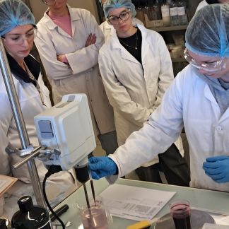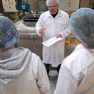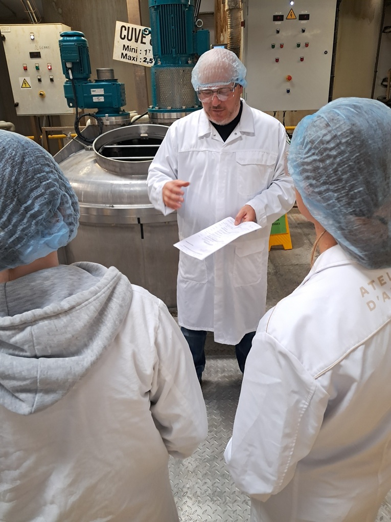 Les étudiants ont visité l’atelier avec ses sept lignes de conditionnement ainsi que la plateforme de formulation avec ses neuf cuves de 500 à 12 000 L. Ils ont pu ainsi découvrir les différents appareils à l’échelle de la production industrielle et voir un exemple de fiche de fabrication de produit.