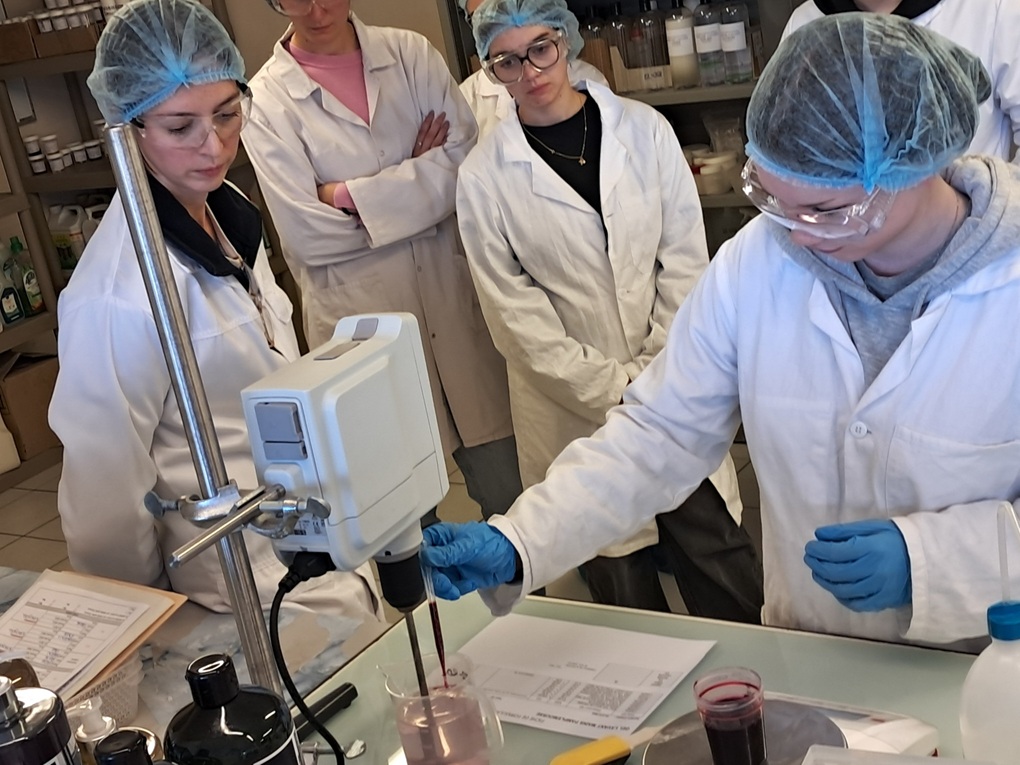Cette visite ne pouvait tomber mieux car le TP de formulation programmé dans la semaine a porté sur la formulation d’un shampooing avec lecture de fiche de fabrication, utilisation de mélangeurs de laboratoire, pH-mètres, pycnomètres et viscosimètres.